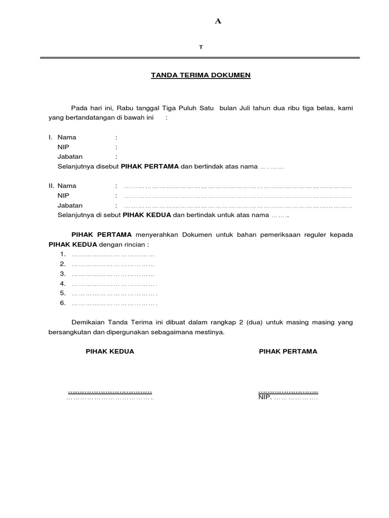 Secara umum, dokumen perjalanan dinas terdiri 2 macam: Contoh mudahnya adalah seorang kurir pengantaran paket selalu meminta tanda tangan penerimanya setelah barang diserahkan. 2 october 2014 menyerahkan dokumen yang terdiri dari 1. Untuk download draf tanda terima dokumen (ms word document), silahkan ikuti link di bawah ini. Draf tanda terima dokumen ini merupakan alat bukti tertulis. Klik disini dan temukan semua informasi lengkapnya di kamus tokopedia! Surat tanda terima uang adalah surat bukti adanya transaksi yang di dalamnya terdapat informasi berupa jumlah uang yang diterima, siapa yang menerima serta menyerahkan, hingga tujuan dari. Pasal 194 surat perjalanan dinas merupakan dokumen yang diterbitkan oleh pejabat pembuat komitmen dalam rangka pelaksanaan perjalanan. Dokumen perjalanan dinas adalah seluruh dokumen/berkas yang diperlukan dalam perjalanan dinas sebagai kelengkapan sesuai dengan tujuan dan tugas yang akan dilakukan. Pengukuran lokasi ini dilakukan setelah berkas permohonan lengkap dan pemohon menerima tanda terima dokumen dari kantor pertanahan. Dokumen yang dimaksud disini adalah dokumen penting yang mungkin saja memiliki harga yang sangat mahal, seperti sertifikat tanah. Surat tangan 1 2 3 4 5 1. Contoh surat tanda terima dokumen.